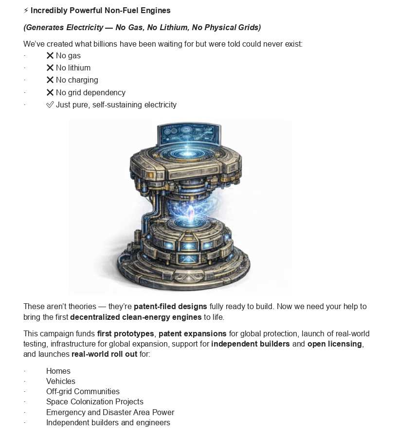 We develop revolutionary no-fuel energy engines designed to function without gas, combustion, lithium, or solar panels. These systems are fully blueprint-ready, provisionally patented, and built for resilience, decentralization, and global energy independence.